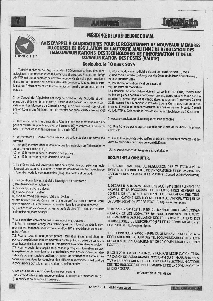 AVIS D’APPEL A CANDIDATURES POUR LE RECRUTEMENT DE NOUVEAUX MEMBRES DU CONSEIL DE RÉGULATION DE L’AUTORITÉ MALIENNE DE RÉGULATION DES TÉLÉCOMMUNICATIONS, DES TECHNOLOGIES DE L’INFORMATION ET DE LA COMMUNICATION ET DES POSTES (AMRTP).