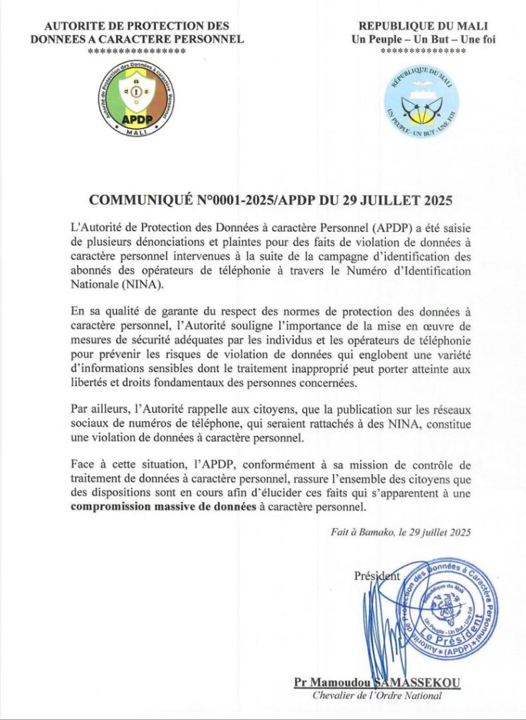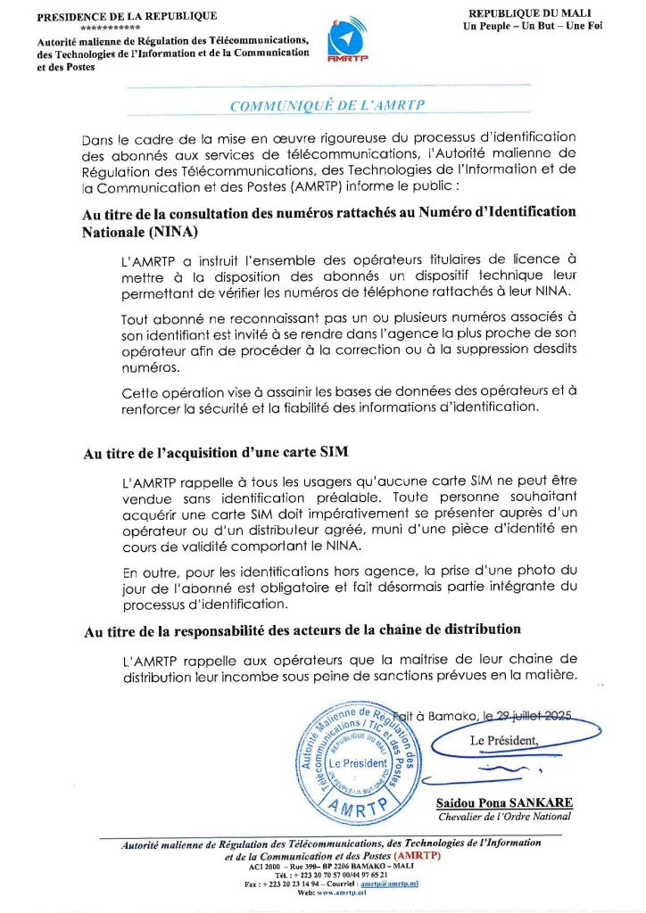 COMMUNIQUES DE L’AMRTP ET DE L’APDP SUR LA CONSULTATION DES NUMÉROS RATTACHÉS AU NUMÉRO D’IDENTIFICATION NATIONALE (NINA)